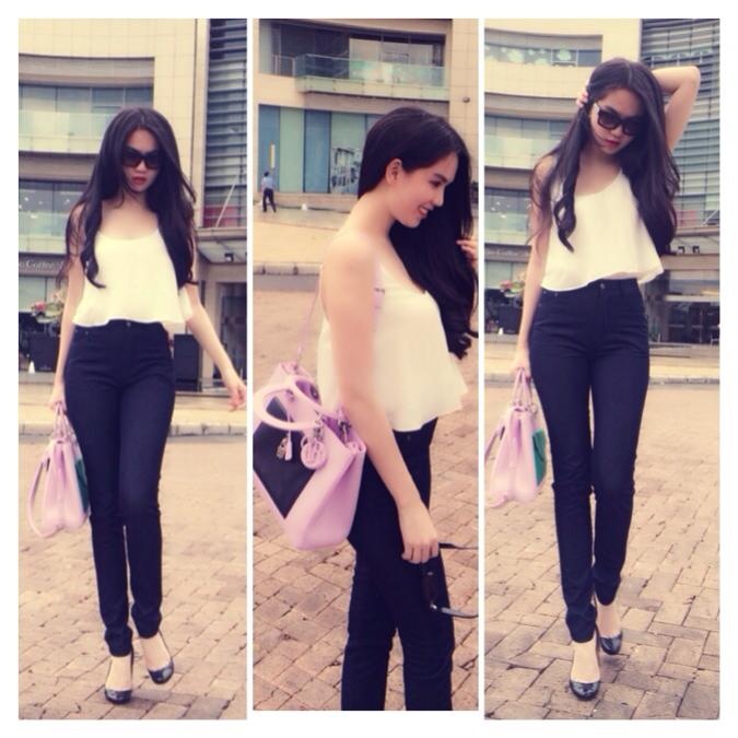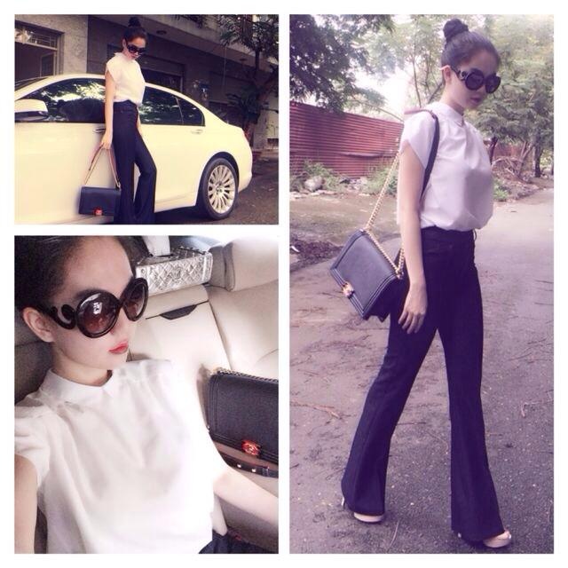 | Trang phục thanh lịch, nữ tính luôn có sức hút với Ngọc Trinh. Mỗi đợt hàng mới vừa ra mắt, "nữ hoàng nội y" là người đầu tiên "thử nghiệm" trước khi sản phẩm được đưa ra cửa hàng. Trong ảnh, cô diện mẫu áo sơ-mi cách diệu gam trắng thanh lịch cùng quần ống loe cổ điển rất tinh tế và hợp vóc dáng. Phụ kiện túi Chanel tối màu mix ăn ý. |