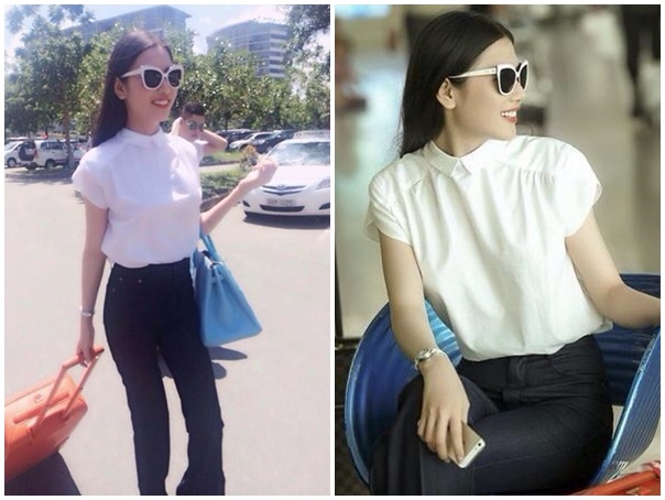 | Không lâu sau, Tường Vy diện lại set trang phục giống như đúc khi nữ người mẫu đáp chuyến bay sang Mỹ tham dự cuộc thi hoa hậu. Cùng một set trang phục, nhưng Ngọc Trinh có phần nổi bật và tinh tế hơn nhờ vóc dáng cân đối và phong thái quyến rũ, tự tin. |