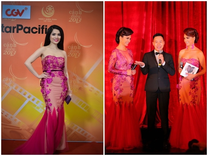 Cặp cựu người mẫu song sinh Thúy Hằng - Thúy Hạnh xuất hiện nổi bật với trang phục đầm dạ hội sang trọng, quý phái tại thảm đỏ Cánh diều vàng 2013 mới đây tại Hà Nội. Cả hai đều nhận được lời khen nhờ trang phục ''cặp đôi'' hài hòa và tinh tế của NTK Hoàng Hải. Tuy nhiên, một số người hâm mộ phát hiện, mẫu váy của Thúy Hằng đã vô tình ''đụng hàng'' với thiết kế mà ''cá sấu chúa'' Quỳnh Nga từng diện.