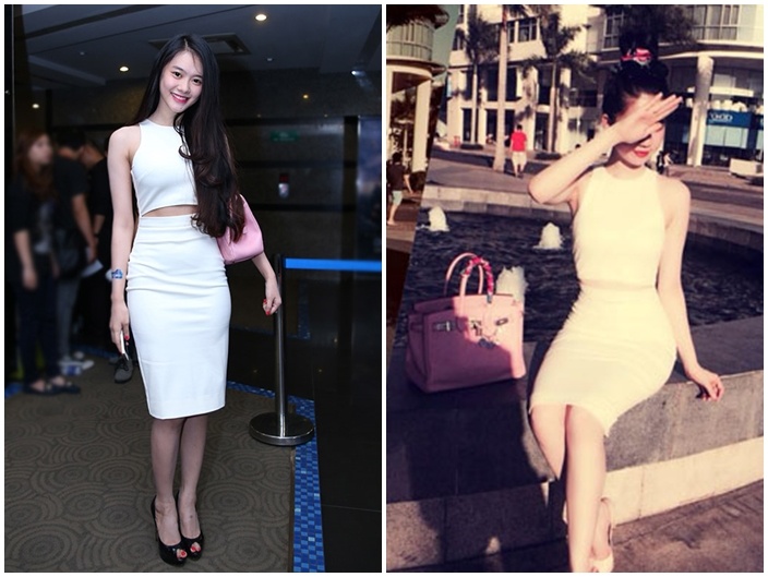 Người mẫu Linh Chi gây chú ý khi góp mặt ở sự kiện ra mắt MV của nhóm nhạc 365 trong tuần vừa qua. Tuy nhiên, trước đó vài hôm, Ngọc Trinh cũng diện thiết kế tương tự khi cô có chuyến lưu diễn cùng ông bầu Vũ Khắc Tiệp tại Mỹ. ''Nữ hoàng nội y'' và đàn em không hề kém cạnh về sắc vóc khi mặc chung một mẫu váy.