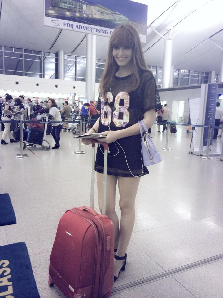 | Người mẫu Andrea có chuyến du lịch xa nhà. Chân dài Hà thành diện mốt áo ''giấu quần'' gây chú ý ở một góc sân bay Nội Bài. |