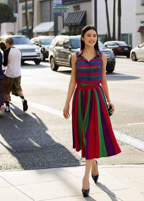 | Trên đường phố New York, chân dài Tường Vy khoe vóc dáng mảnh mai với bộ cánh nhiều màu sắc của NTK Đỗ Mạnh Cường. |