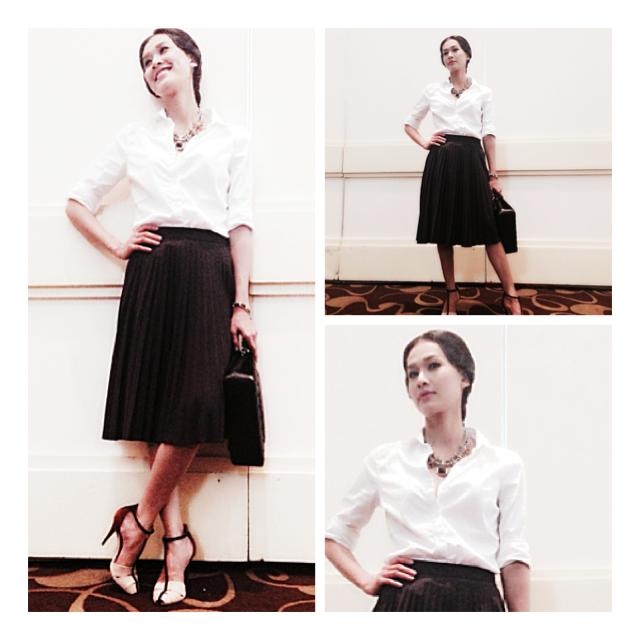 | Dương Mỹ Linh nổi bật trong bộ trang phục thanh lịch, áo sơ-mi và chân váy xếp ly hiện đại. |