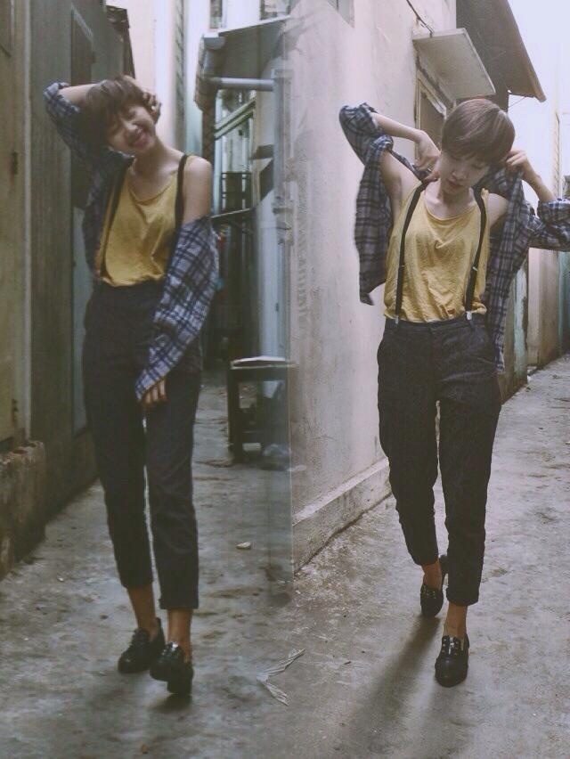 Người mẫu Phan Linh để lại nhiều dấu ấn với gu thời trang cá tính, năng động. Trong một set trang phục, cô trung thành với phong cách cổ điển, mạnh mẽ. Người mẫu diện quần âu tối màu, áo thun vàng, áo khoác ca-rô tạo điểm nhấn. Cô tự tin thể hiện những hình ảnh đầy ngẫu hứng.