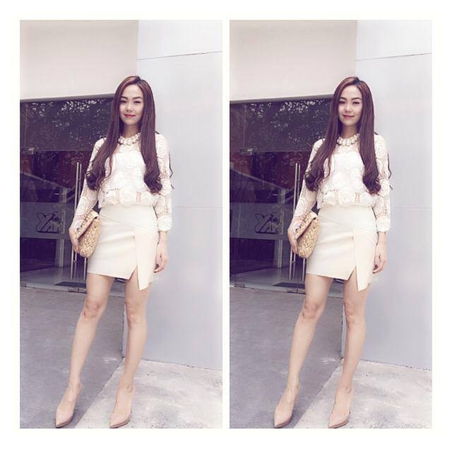 Một ngày khác, nữ ca sĩ khiến người hâm mộ xuýt soa với bộ cánh đồng tông trắng tinh khiết. Áo hoa 3D phối cùng chân váy xẻ rất sáng tạo. Phụ kiện túi cầm tay ánh vàng tạo hình ảnh thanh lịch, nhã nhặn.