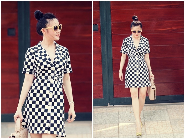 Ca sĩ Vy Oanh chuộng phong cách cổ điển. Người đẹp diện trang phục có họa tiết ô vuông trắng đen rất thanh lịch, nhã nhặn.