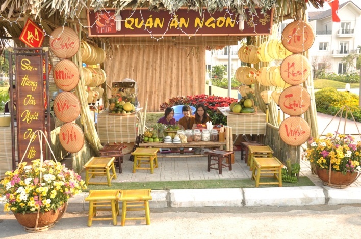 Không gian chợ Tết xưa đã được tái hiện tinh tế tới từng chi tiết tại gian hàng Phố Tết - Quán Ăn Ngon trong khuôn khổ hội chợ xuân ở Vinhomes Riverside.