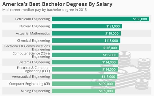 Theo kết quả cuộc khảo sát của Hiệp hội các trường đại học và nhà tuyển dụng Mỹ (NACE), với người đi làm mới tốt nghiệp đại học năm 2015, những ngành nghề sau đây có mức lương cao nhất: