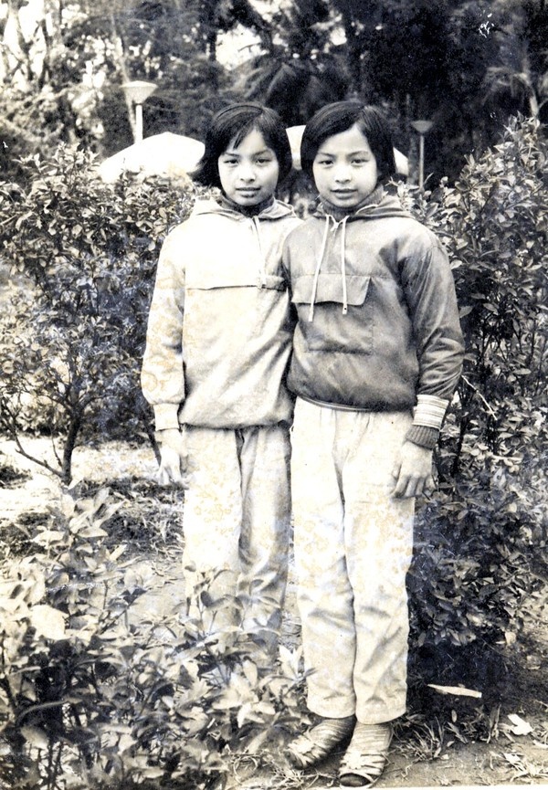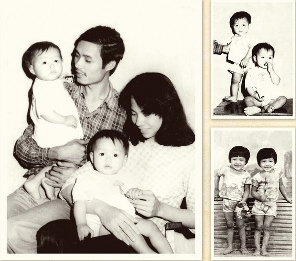 | Từ nhỏ 2 chị em được bố mẹ mặc quần áo, kiểu tóc giống hệt nhau. |