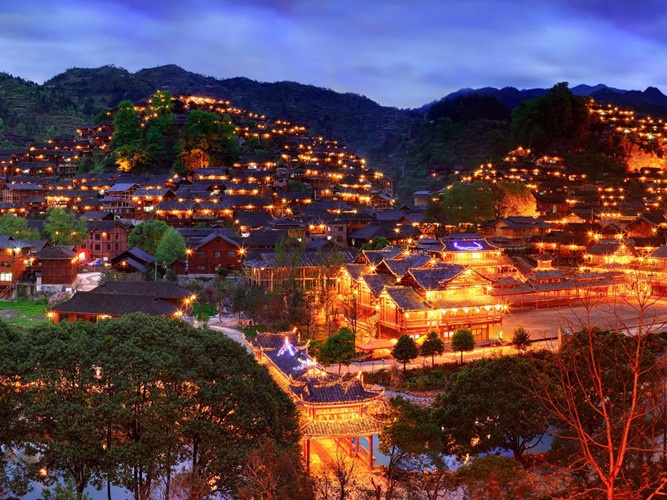 Xijang Miao là ngôi làng của người Miao lớn nhất ở Trung Quốc, còn được gọi là "làng nghìn hộ dân". Nơi đây được bao bọc bởi thung lũng, đồi núi rộng lớn và rất nhiều ruộng bậc thang. Về đêm, khung cảnh nơi đây lung linh, huyền ảo hớp hồn du khách. |