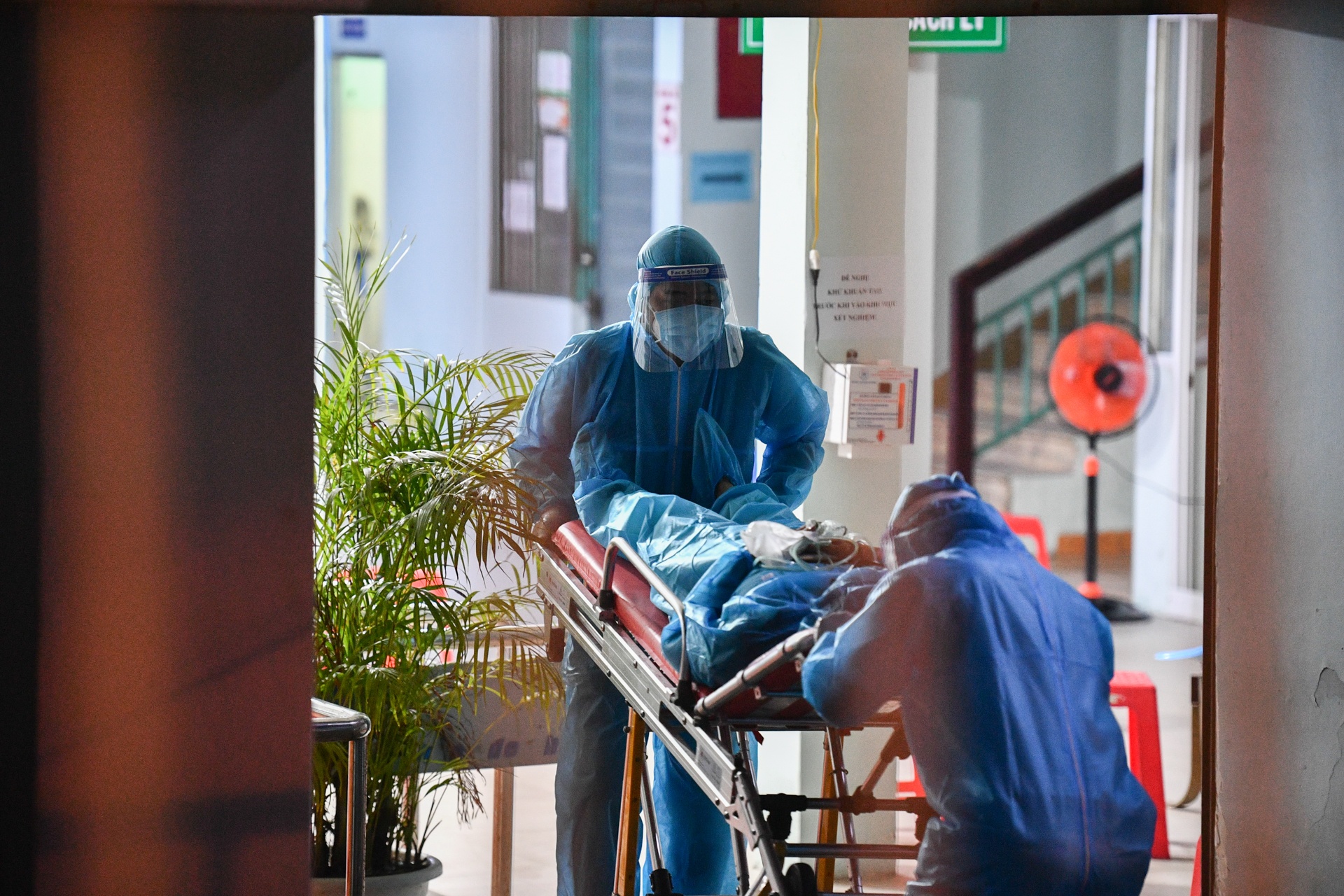| Nhân viên của Trung tâm Y tế quận Gò Vấp khẩn trương mặc đồ chống dịch để di chuyển F1 có triệu chứng đi điều trị. |