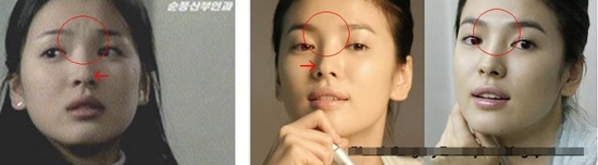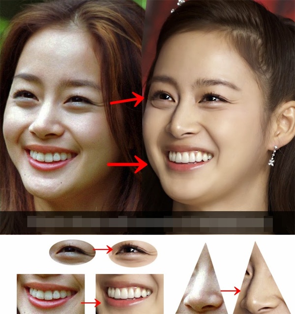 | Shin Min Ah nổi tiếng là sao nữ gợi cảm của Hàn Quốc và vẻ đẹp tự nhiên. Nhưng những hình ảnh so sánh cho thấy, Min Ah đã thẩm mỹ khá nhiều: chỉnh mắt để có mắt hai mí rõ nét hơn, chỉnh mũi, chỉnh trán, nâng ngực |