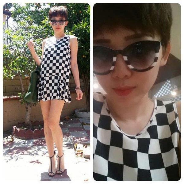 | Đầm kẻ đen trắng hot một thời cũng được cô tận dụng khi dạo phố. |