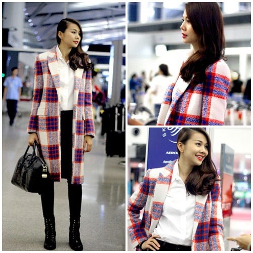 Hình ảnh người đẹp trên sân bay với áo khoác kẻ sành điệu của Zara.