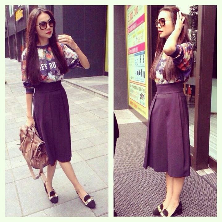 Cũng với đôi giày này, cô mix kèm áo in hoa của Zara.