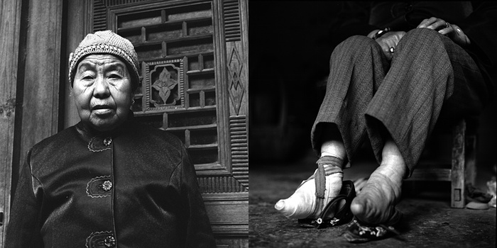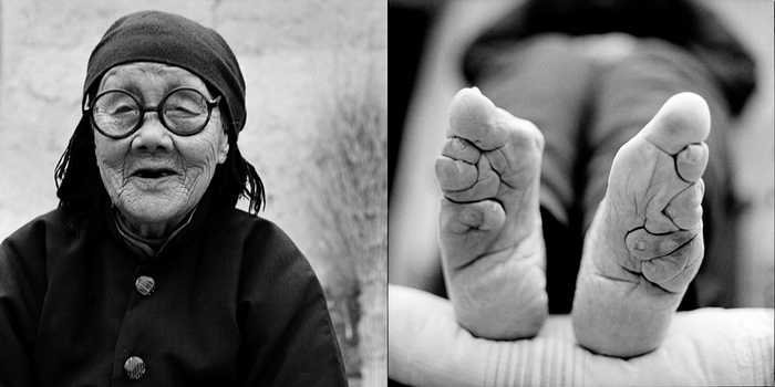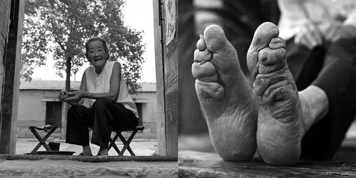 Bà Pue Hui Ying, 76 tuổi sống tại Vân Nam trong bức hình chụp năm 2011. Chân của bà đã bị bó trong 7 năm, sau đó được cởi ra trong khoảng 12 năm. Các ngón chân bị gẫy quặp khiến bà khó có thể đi đứng bình thường. Vì thế, Pue quyết định quay lại và chung sống với việc bó chân cho tới tận hôm nay.