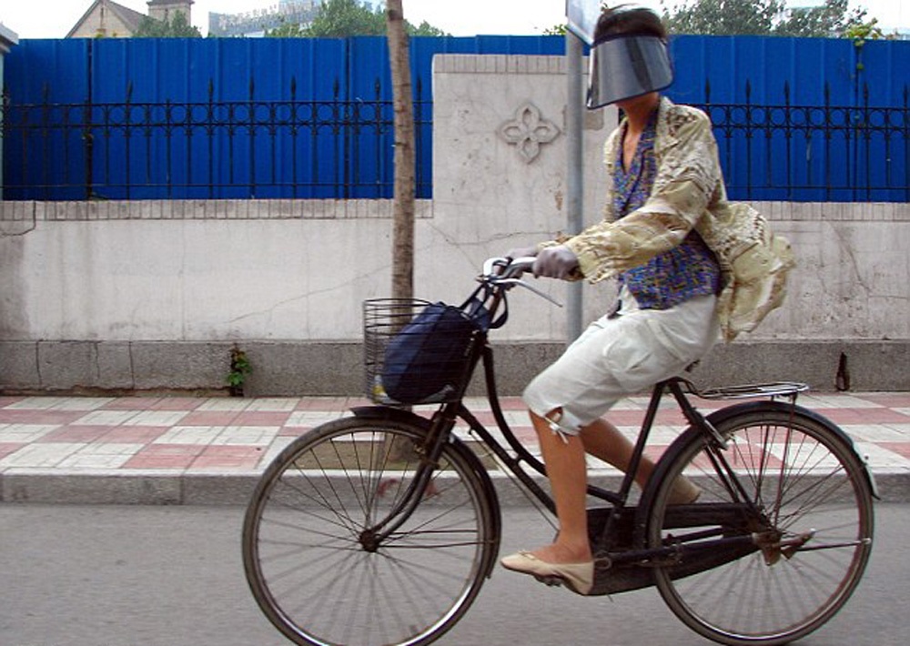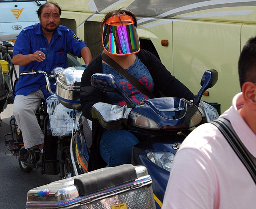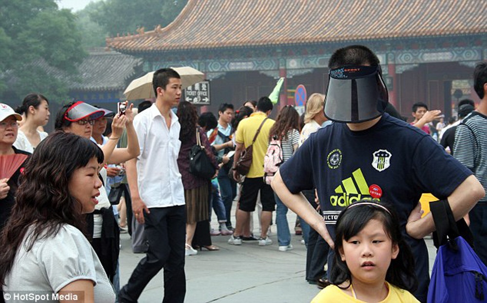 Nhiều người Trung Quốc tận dụng kính lưỡi trai màu đen che kín mặt để tránh nắng khi ra ngoài đường.
