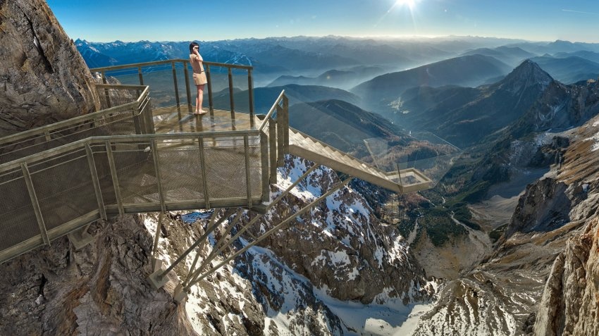 Nếu đủ can đảm để bước tới điểm tận cùng của đài quan sát, du khách sẽ được chiêm ngưỡng toàn bộ vẻ đẹp độc nhất vô nhị của đỉnh Zugspitze và hẻm núi Hollental bên dưới.