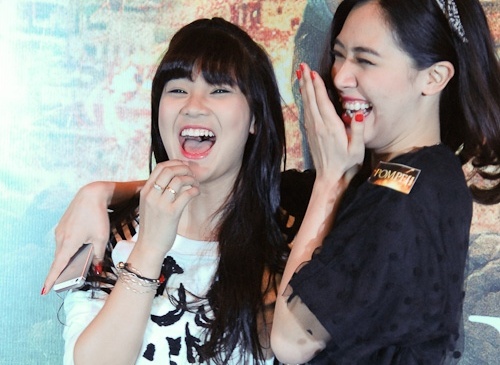 | Hoàng Yến Chibi và Hà Min cười tít mắt khi chạm mặt nhau trong một họp báo. Ảnh: Pháp luật xã hội. |