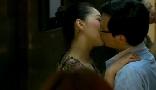 | Trong bộ phim Váy hồng tầng 24, Hứa Vĩ Văn (vai Hữu Điền) vừa hôn say đắm Minh Khuê (vai Thảo Nhi). |