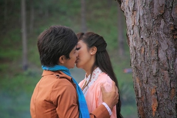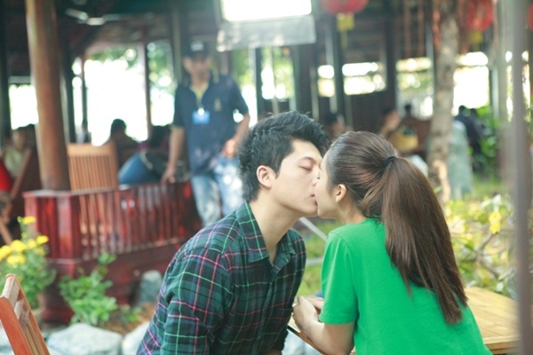 | Huyền Lizzie (vai Linh) và Anh Tuấn (vai Tuấn) có nụ hôn đầy lãng mạn trong phim Trái tim có nắng. |