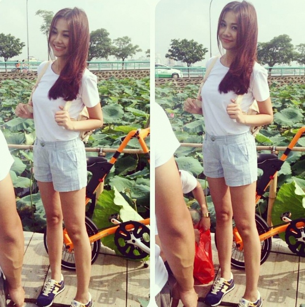 | Đôi giày khi mix kèm bộ trang phục không mấy phù hợp làm lộ nhược điểm chân ngắn của Khánh Thi. |