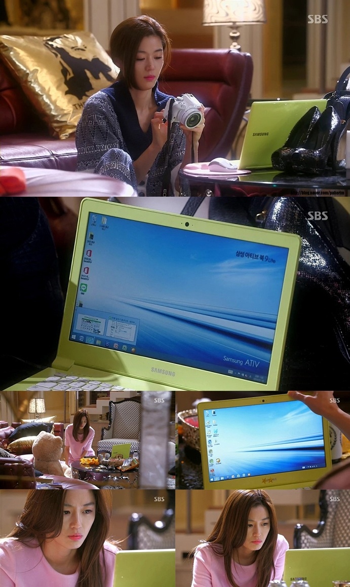 | Chiếc laptop mới màu vàng chanh của hãng Samsung do Jun Ji Hyun sử dụng trong một cảnh quay được camera ghi lại trong khá nhiều lần, tên nhãn hàng hiện rõ ở góc phải máy tính. |