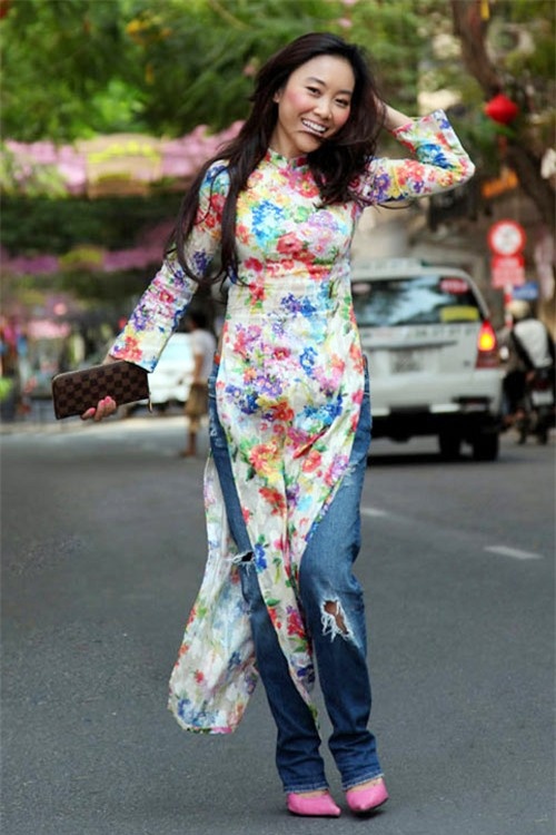 | Song, nếu như Hà Hồ trung thành với áo dài truyền thống, chỉ thêm một chút nhấn nhá để tạo điểm nhấn thì Đoan Trang lại táo bạo trong cách kết hợp áo dài với quần jeans, pha trộn giữa truyền thống và hiện đại. Sự phá cách mạnh mẽ của nữ ca sĩ cũng từng nhận khá nhiều ý kiến trái chiều từ dư luận. |