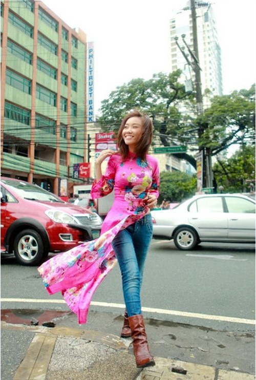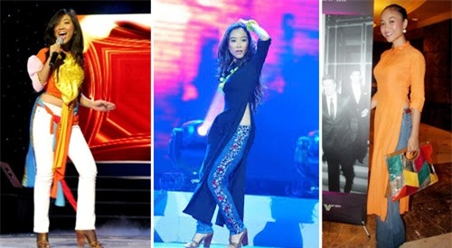 | Cách kết hợp truyền thống pha nét hiện đại giữa áo dài và quần jeans đã trở thành một "thương hiệu" của nữ ca sĩ |