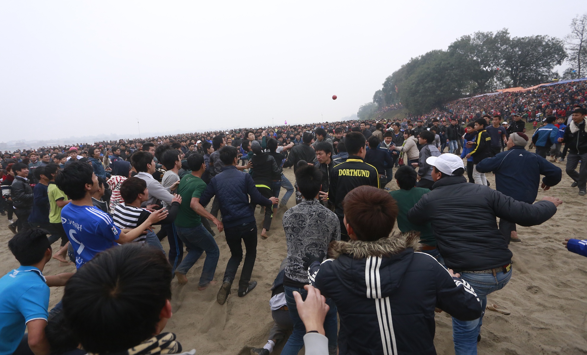 | Mặc dù chủ tế chưa cầm phết ra ngoài bãi giữa nhưng hàng nghìn người đã vây quanh hố cát nơi quả phết được thả xuống. |