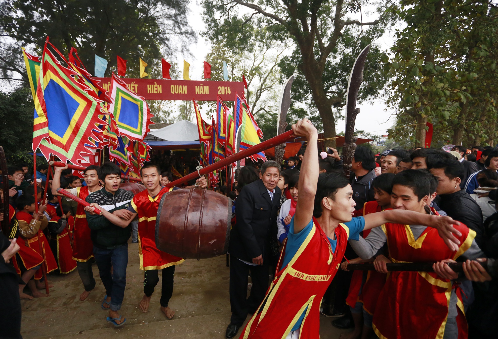 Hội cướp phết diễn ra chiều 12 và 13/1 (âm lịch) tại đền thờ nữ tướng Thiều Hoa, làng Hiền Quan (Tam Nông, Phú Thọ). 13h chiều, trai tráng trong làng khiêng trống cầm gậy khua khắp đường làng để tạo không khí lễ hội.