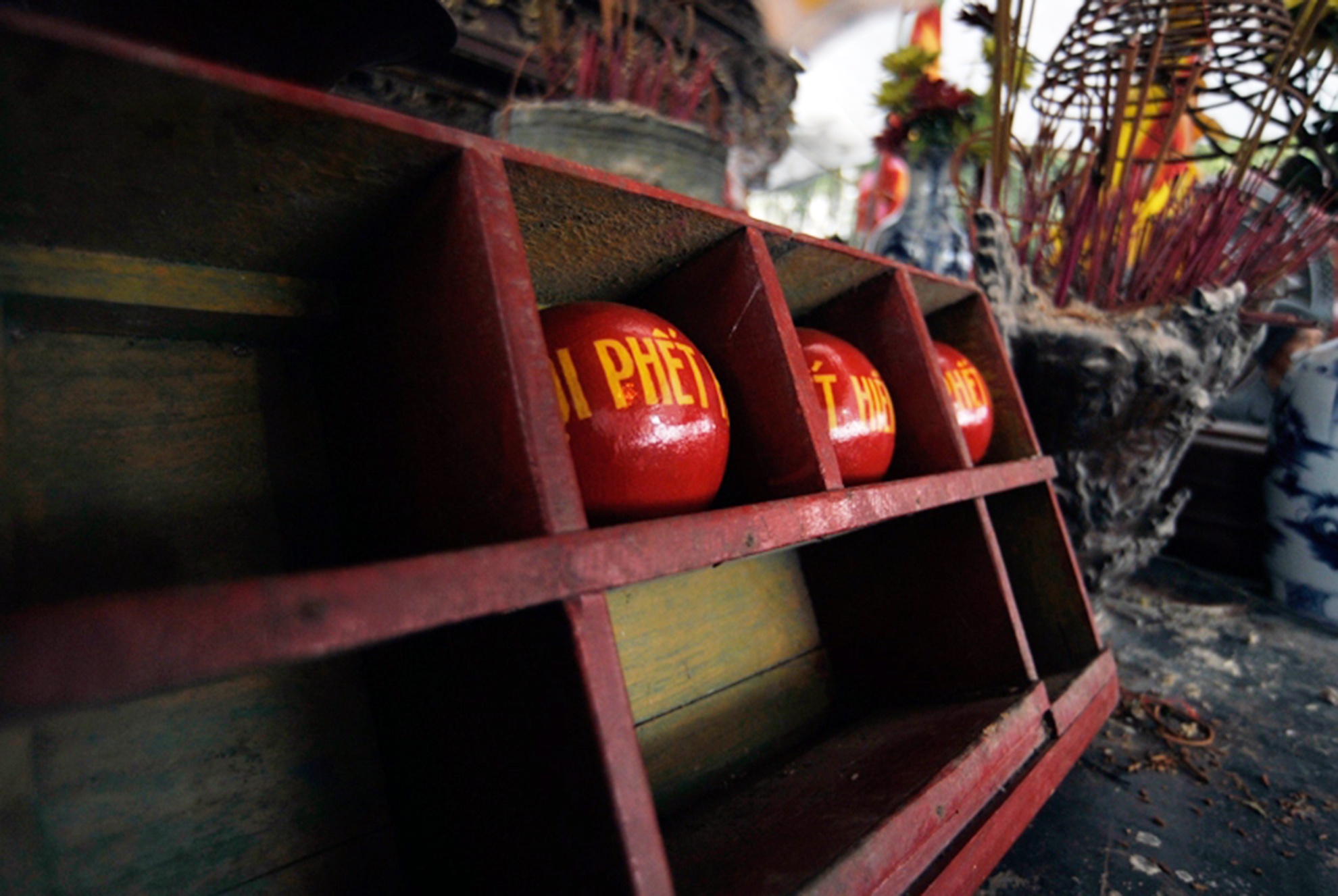 | Ba quả phết được ngự trên ban thờ. Phết làm từ gốc tre, sơn son đỏ tượng trưng cho mặt trời. |