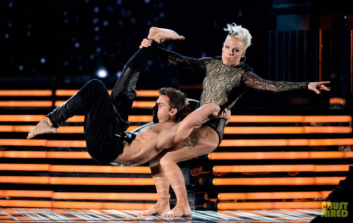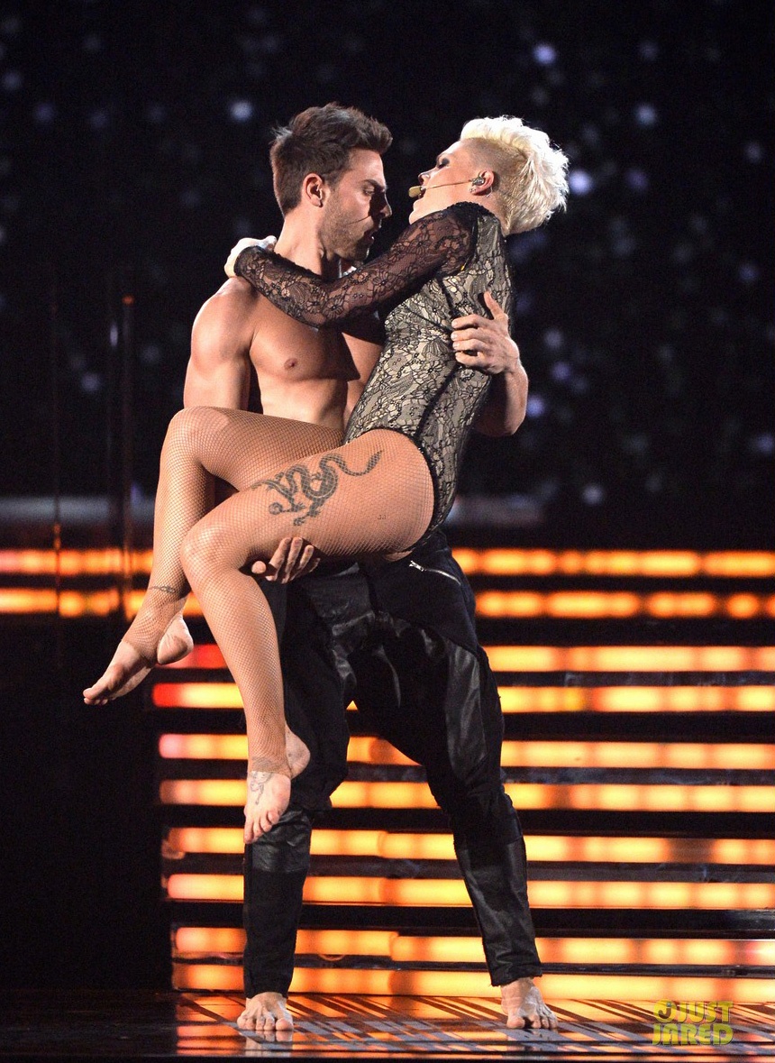 | Trình diễn Try và Just Give Me A Reason cùng Nate Ruess, Pink khiến fan phải nín thở với phần trình diễn mang đậm phong cách... xiếc của mình. |