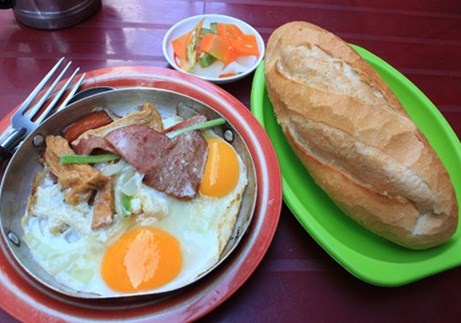 Tiệm nhỏ xíu, xập xệ, bảng hiệu cũ kỹ đã nhuốm màu thời gian nhưng chất lượng bánh mì vẫn nguyên hương vị như những ngày đầu. Thành phần của bánh mì ở đây không có gì đặc biệt, cũng ốp la, chả lụa, thịt nguội, pate, đồ chua,... nhưng thay vì cho vào trong ổ bánh mì, tất cả được chiên vàng trên một chiếc chảo nhỏ nên luôn đảm bảo độ nóng giòn và thơm ngon cho thực khách.