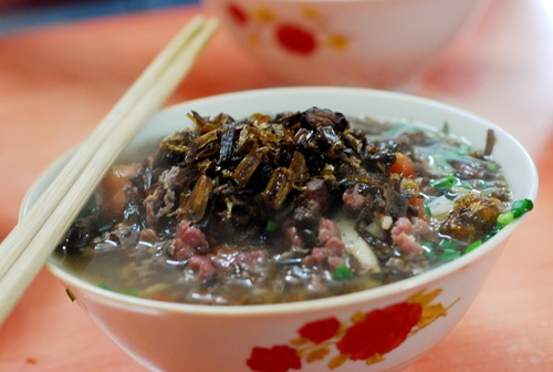 | 10. Bún thang xóm Hà Hồi: Những ai mê bún thang và không thích sự xô bồ thường chịu khó lần vào xóm Hà Hồi (nằm ở phố Quang Trung). Tại đây có một tiệm bún thang lâu năm, khá đông nhưng không bao giờ đến mức nghẹt thở. Bún thang Hà Hồi có đủ thịt gà, trứng rán thái sợi, mọc, củ cải khô… Ưu điểm là nước canh chế biến vừa miệng, củ cải khô không thái sợi mà để cả miếng to, nhai sần sật, giòn giòn. Hơn nữa, đến đây con ngõ bình yên này ăn sáng, khách thấy dễ chịu, thảnh thơi, nên cảm giác món ăn ngon miệng hơn. |