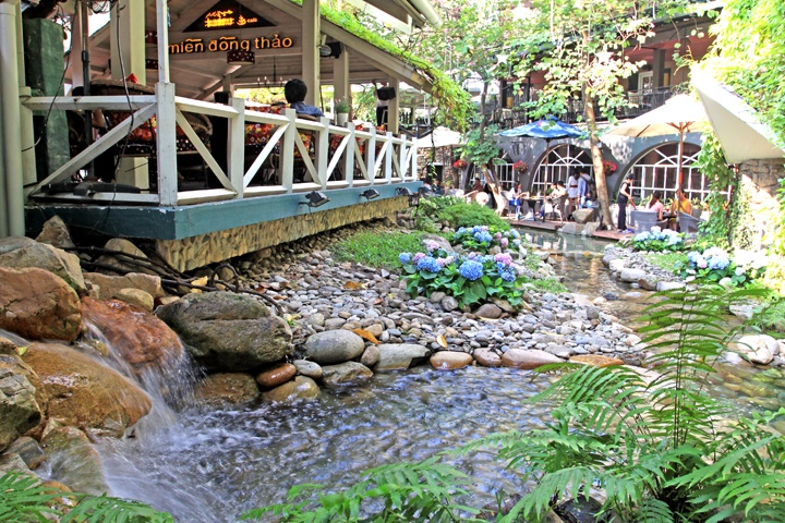 Miền Đồng Thảo tựa như ngôi nhà nhỏ ngát hương hoa trên thảo nguyên đầy gió giữa Sài Gòn. Kiến trúc lệch tầng và hình chữ U của quán mang đến cho nơi này không gian mới lạ, rộng rãi. Dòng suối nhỏ cùng không gian xanh mướt cũng là lý do người ta tìm đến quán nhiều hơn. |