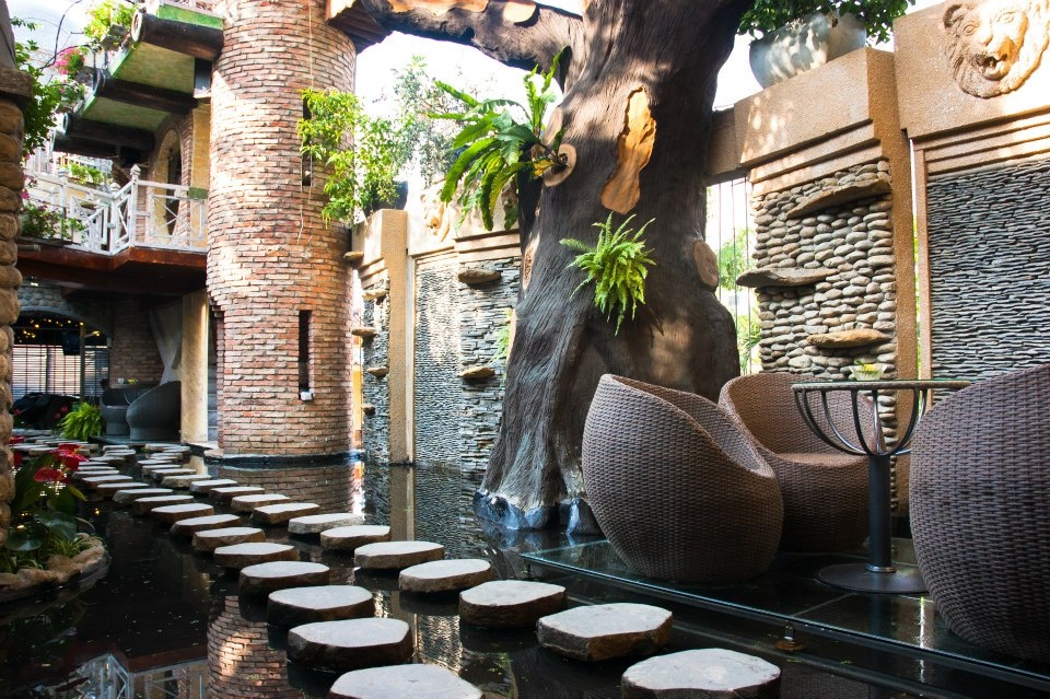 Oasis Cafe mang đến cho bạn trải nghiệm mới lạ, độc đáo của việc uống cà phê trên cây, hầm giữ xe mô phỏng hầm rượu thời La Mã, bức tường hay trần nhà với đá, nắp chai rượu ngoại hay chất liệu rơm. |