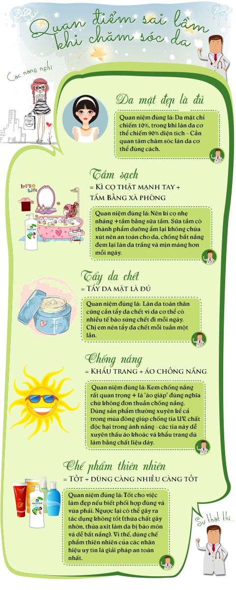 Chỉ cần da mặt đẹp là đủ, chống nắng bằng khẩu trang và áo choàng, dùng càng nhiều chế phẩm thiên nhiên càng tốt... là những suy nghĩ sai lầm của nhiều chị em khi chăm sóc da.