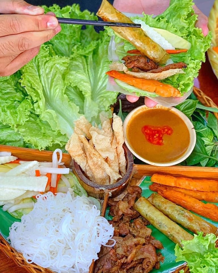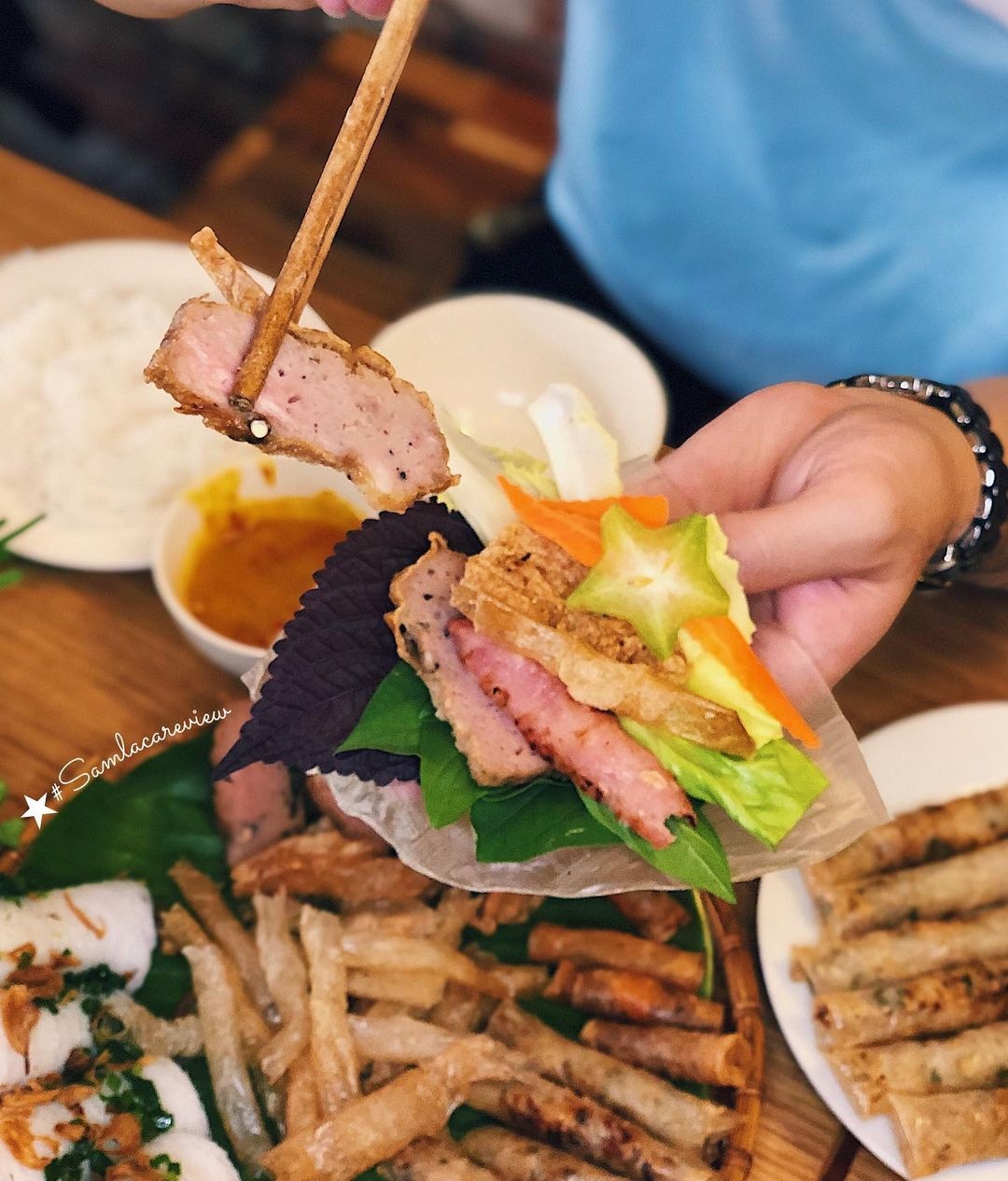 Hà Hoàng Trúc Anh: "Nước chấm có vị béo béo, thêm sa tế vào sẽ ngon hơn. Nếu đi nhóm 2-3 người, bạn nên gọi phần thập cẩm có giá 90.000 đồng sẽ rẻ hơn chút, đầy đủ như nem nướng, ram bắp, thịt nướng".