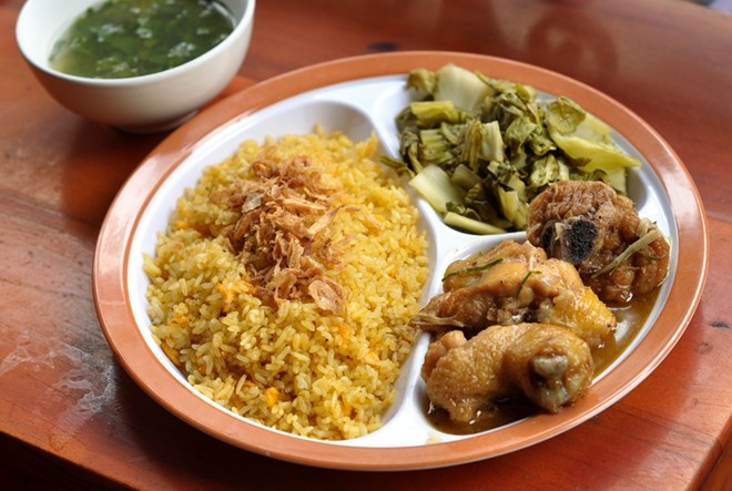 Trông khá giống các tiệm chuyên phục vụ Tây ở khu phố cổ nhưng món chủ đạo nơi đây đều thuần Việt – cơm đảo sườn rim và cơm đảo gà rang, và giá chỉ khoảng 35.000 – 40.000 đồng/suất.