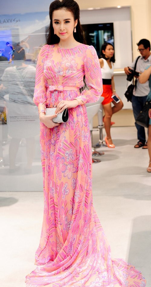 Chiếc đầm dài tha thướt và có phần đứng đắn lại trở nên dễ thương hơn nhờ việc lựa chọn tông hồng của Thái Hà