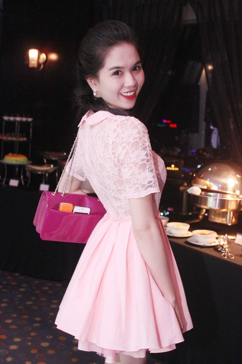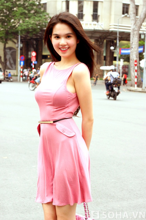 | Tông hồng hoa mười giờ giúp nổi bật làn da trắng sứ của Ngọc Trinh. |