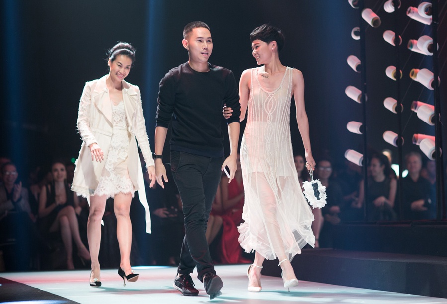 | Nhà thiết kế Lâm Gia Khang cùng các người mẫu chào kết thúc show diễn. |