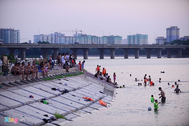 | Hồ Linh Đàm trở thành bãi tắm trong những ngày nóng 40 độ C tại Hà Nội. Ảnh: Lê Hiếu. |