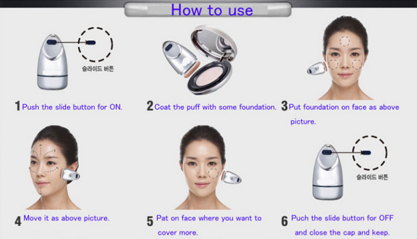 Một sự kết hợp hoàn hảo của công nghệ cao và làm đẹp. Máy trang điểm giúp người sử dụng có được lớp nền hoàn hảo, đều màu và thấm sâu vào da. Cách sử dụng máy rất đơn giản, chỉ cần bật máy lên, chấm đầu bông mút vào phấn nền và tán đều lên mặt.