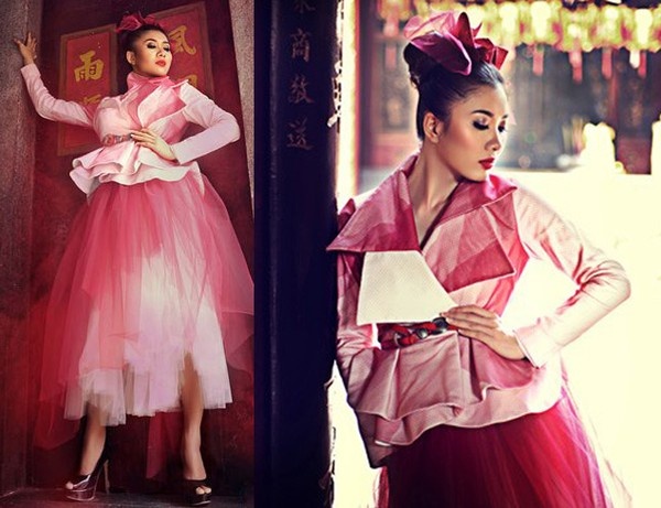 | Trang phục của Nguyệt Ánh rườm rà quá mức. Cô như ngập chìm trong tầng tầng lớp lớp vải, với sắc hồng ngọt đến khé cổ. |