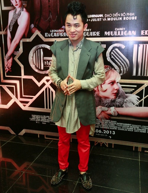 | Tùng Dương rất nổi bật với quần da màu đỏ ớt, áo khoác màu bộ đội, áo sơ mi lụa và giầy da tán đinh độc đáo. |