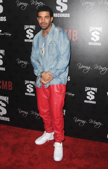 | Drake bụi bặm và chịu chơi với áo sơ mi denim cùng quần da đỏ. |