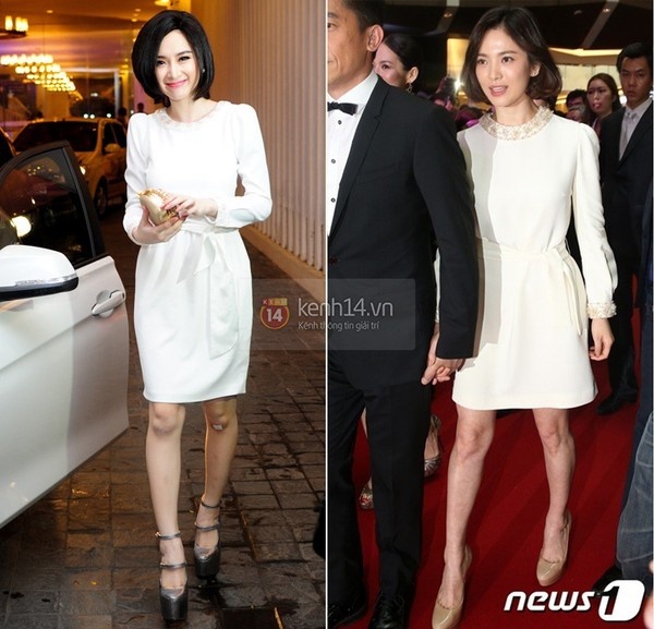 Ngoài Phạm Băng Băng, Song Hye Kyo cũng là "hình mẫu" Angela Phương Trinh chọn để copy hoàn toàn phong cách, từ tóc, váy cho tới cả cách trang điểm.