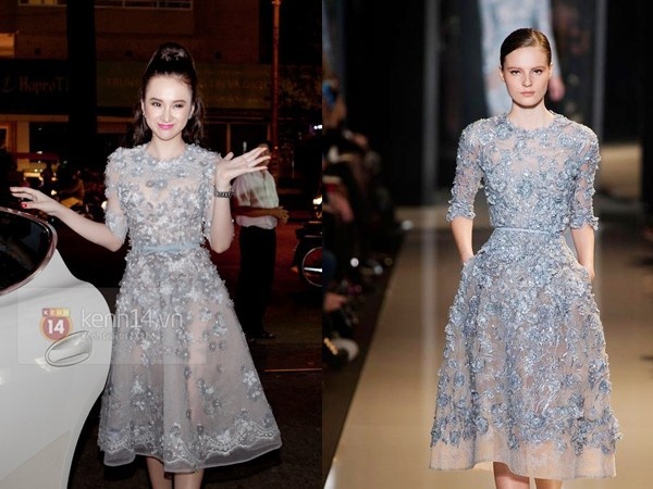 | Angela Phương Trinh cũng gây ngạc nhiên khi vô tư diện những mẫu thiết kế nhái loạt thương hiệu đình đám như Elie Saab... |